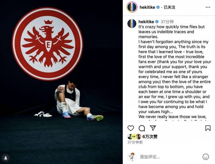 直播吧7月25日讯 埃基蒂克正式从法兰克福转会利物浦,这位法国前锋更新社交媒体发长文深情告别法兰克福。